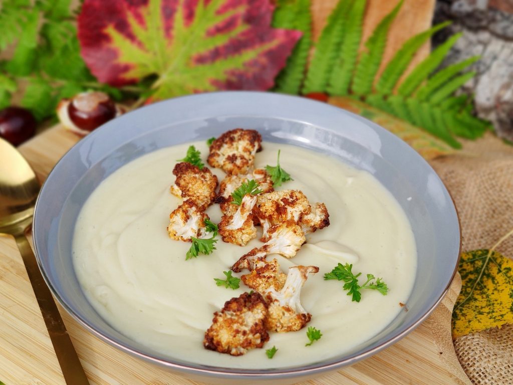 Diese vegane Blumenkohlcremesuppe überzeugt mit ihrer herrlich cremigen Konsistenz dank Cashewkernen und wird durch knusprig im Airfryer gebackene Blumenkohlröschen als Einlage nicht nur zum gesunden, sondern auch zum raffiniert aromatischen Genuss.